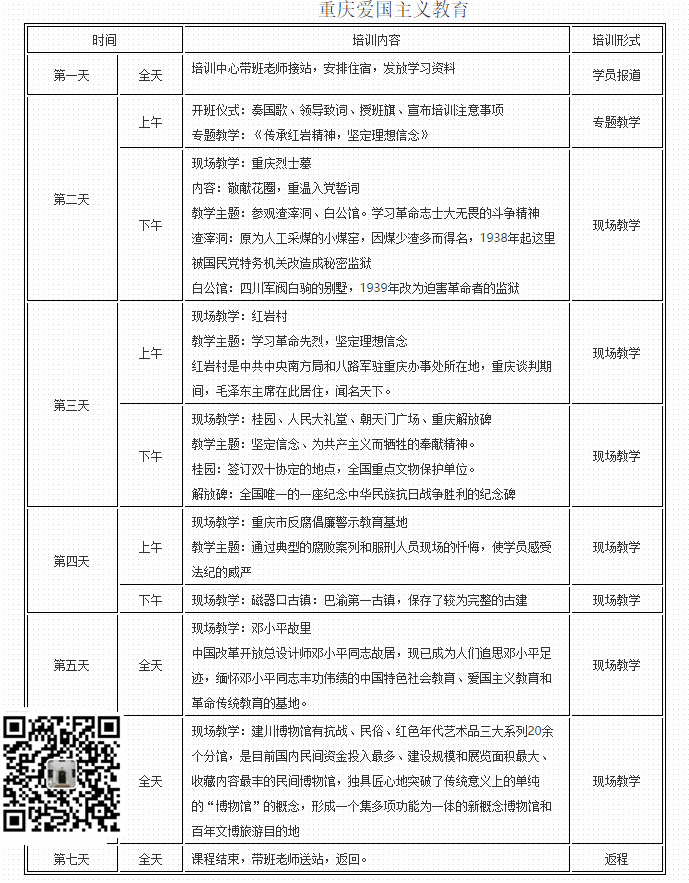 红岩精神谱写的是共产党人矢志不渝的崇高理想,百折不挠的革命斗志,视死如归的献身精神以及共产党人同舟共济的团结精神。通过此次参观学习,大家接受了一次生动的革命传统教育,进一步增强了共产党员的责任感、光荣感和使命感。以下是重庆爱国主义培训7天方案,详情请扫码。